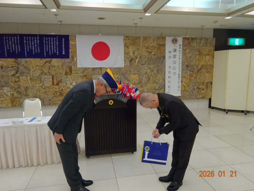会長 L森下時彦よりラベルピン・入会キットの贈呈